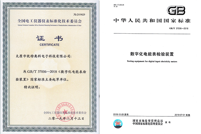 優(yōu)特奧科作為主要起草單位的國家標(biāo)準(zhǔn)《GB/T37006-2018數(shù)字化電能表檢驗裝置》于2018年12月28日發(fā)布,2019年7月1日實施。