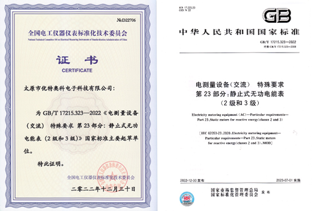 優(yōu)特奧科作為主要起草單位的國家標(biāo)準(zhǔn)《GB/T17215.323-2022電測量設(shè)備(交流)特殊要求 第23部分:靜止式無功電能表(2級和3級)》于2022年12月30日發(fā)布,2023年7月1日實施。