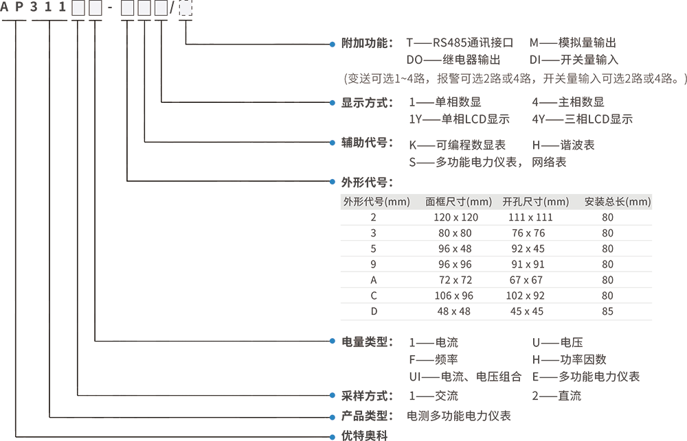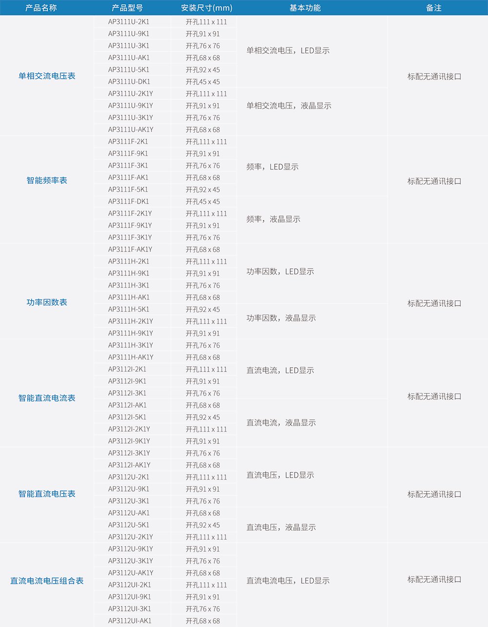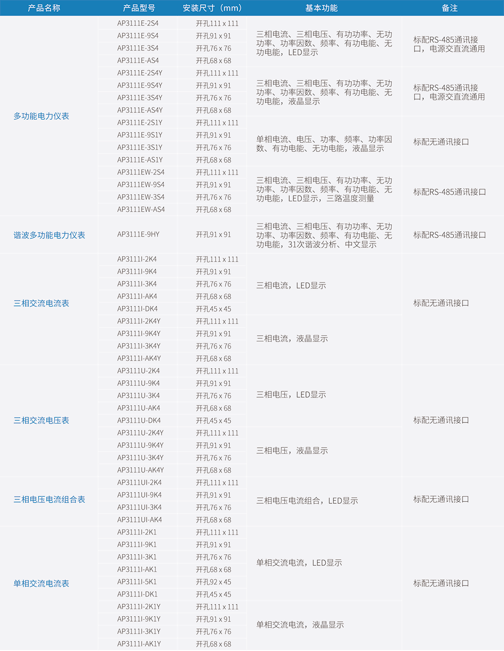 AP311系列多功能電力儀表為新一代可編程、經(jīng)濟(jì)型、安裝式多功能電力儀表,該系列儀表采用SMT生產(chǎn)工藝、交流采樣、真有效值( RMS )測(cè)量方式,具有RS-485數(shù)字接口,采用MODBUS-RTU通訊規(guī)約。該系列儀表種類齊全,可單獨(dú)或組合實(shí)現(xiàn)三相電流、三相電壓、單相電流、單相電壓、有功功率、無功功率、功率因數(shù)、頻率、有功電能、無功電能等數(shù)據(jù)的顯示、采集及傳輸;各類產(chǎn)品均提供LED顯示和液晶顯示兩種選擇。廣泛用于工業(yè)、商業(yè)、民用電力系統(tǒng)和變電站中。