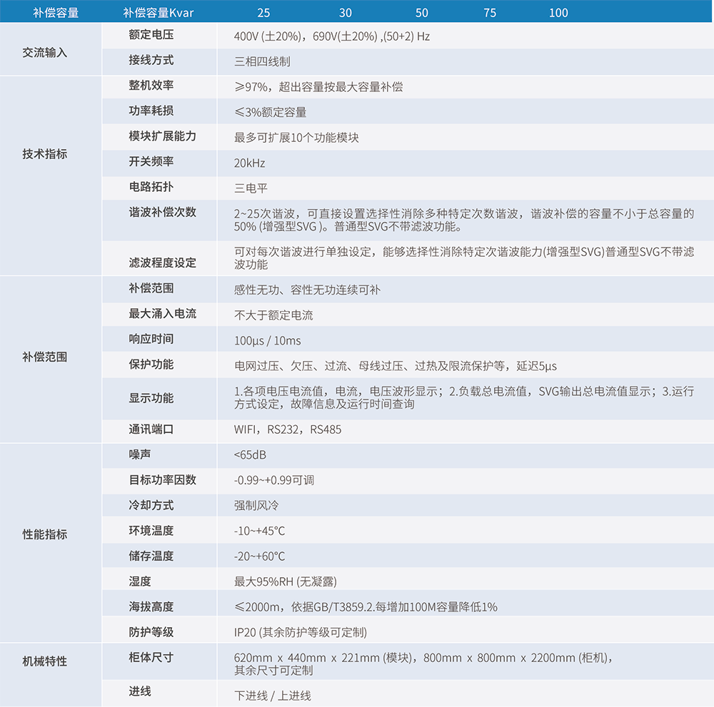 AP3521系列靜態(tài)無功補償發(fā)生器(SVG)采用可控電力電子器件發(fā)出無功及反向的濾波補償電流,可以實現(xiàn)快速、精確、雙向無功補償;并可以針對13次及以下頻段諧波快速、精確濾除,降低了系統(tǒng)諧振風險;同時還可以消除中性線諧波和三相不平衡。